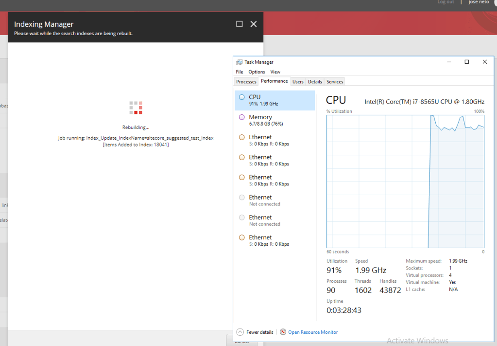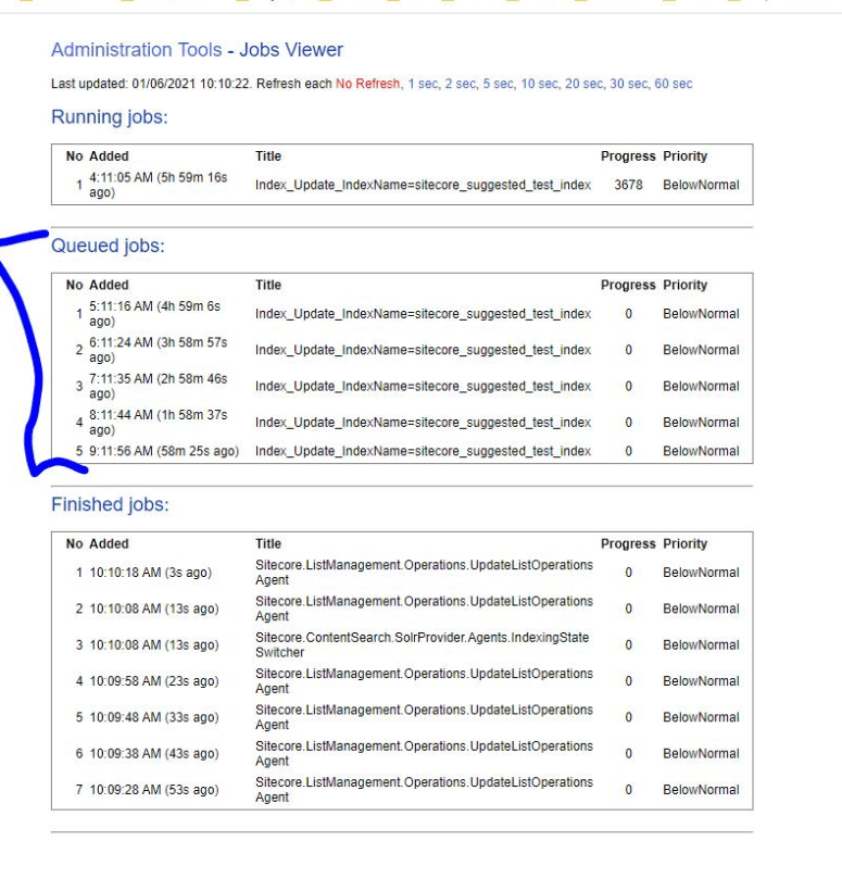 Below, we can see a production environment, with a list Queue jobs that are running and taking a lot of TIME and CPU usage to execute the reindex of “sitecore_suggtested_test_index”.