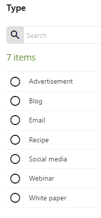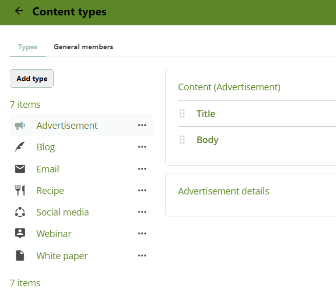Sitecore Content Hub CMP comes with some default temples, Advertisement, Blog, Email, Recipe, Social media, Webinar, White paper